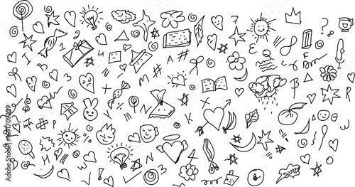 Hand Drawn Doodle Icons Collection – Hearts, Stars, Flowers, Arrows, Sun and Fun Sketch Elements on White Background