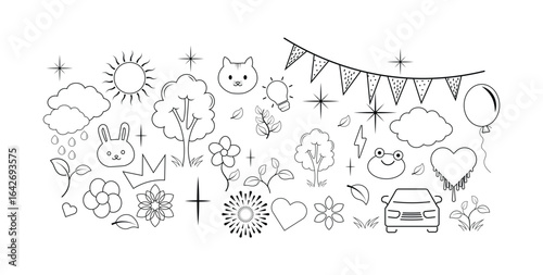 Hand Drawn Doodle Set with Nature and Cute Icons, Vector Sketch Elements of Trees, Flowers, Animals and Balloons, Isolated on Transparent Background