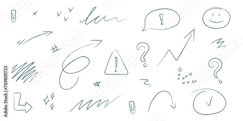 Hand drawn doodle vector set. Smile, arrow, star, scribble, question mark, exclamation mark, triangle, clip. Business vector illustration.
