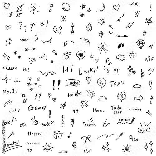Hand drawn doodles icon in flat style. Speech bubbles, arrows and shapes vector illustration on isolated background. Drawing sketch sign business concept.