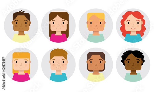 Hand drawn flat style vector design concept illustration of a diverse group of men and women, male and female faces avatars. Flat style round vector icons character avatar set.