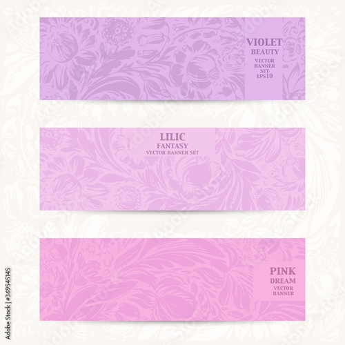 Hand drawn floral horizontal banners with roses, dahlia, poppy, iris, marigold,