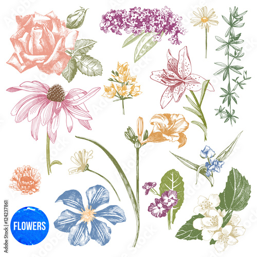Hand drawn garden flowers set