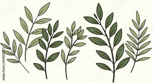 Hand Drawn Green Botanical Illustrations Set of Various Leaves and Branches