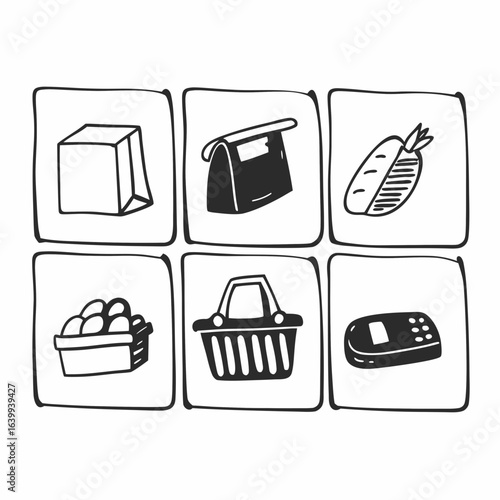 Hand drawn grocery store icons representing shopping, food, and retail isolated on white background
