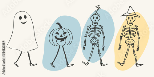 Hand Drawn Halloween Characters Walking Ghost Pumpkin and Skeletons with Hats on Light Blue and Yellow Backgrounds