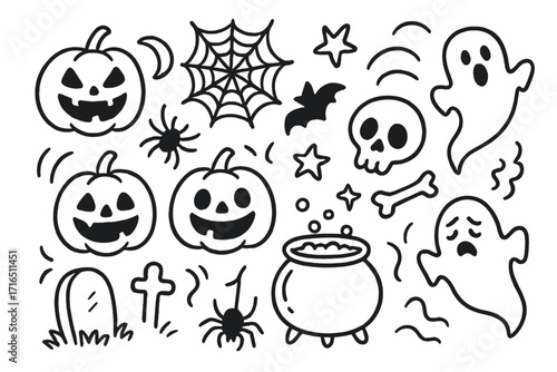 Hand drawn Halloween doodles set. Cute spooky cartoon sketch elements. Vector collection with jack o'lantern pumpkin, ghost, spider, skull, bat, web, cauldron, and tombstone.
