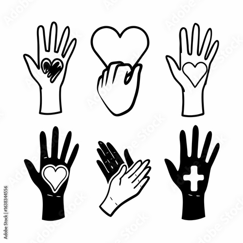 Hand drawn hands with hearts and a cross isolated on white background representing love and support