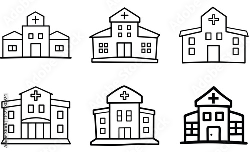 Hand Drawn Hospital Building Icons Set – Medical Clinic Outline Vector Collection