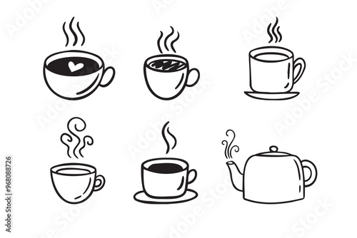Hand drawn hot drinks set. Doodle coffee cups white background. Coffee, tea, cappuccino, espresso, latte, americano, hot chocolate