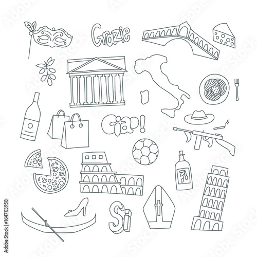 Hand drawn icons with Italy symbols - Pisa tower Coliseum mafia carnival theater football wine olive oil pizza flag gondola. Stickers, pins and patches in line style