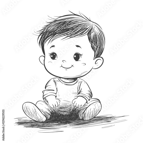 Hand Drawn Illustration Of A Smiling Baby Boy Sitting On The Floor