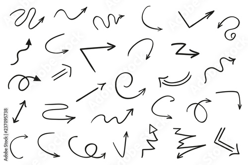 Hand drawn infographic elements on white. Abstract arrows. Line art. Set of different signs. Black and white illustration. Doodles for artworks