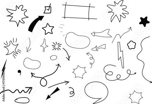 Hand drawn line chalk brush stroke arrow icon set. Chalk crayon underline, check mark, scribble and texture in rough hand sketch style. Drawn heart, frame, star design shapes. Vector illustration