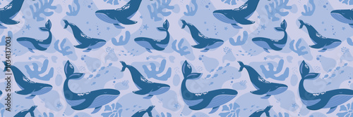 Hand drawn marine life. Seamless pattern with wild sea animals, seaweed and corals. Children's illustration on blue background. Cartoon whales and sperm whales bright colors.