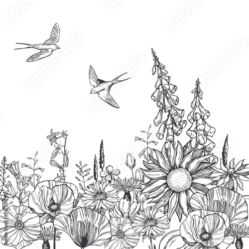 Hand drawn meadow flowers and swallows. Vector sketch illustration.