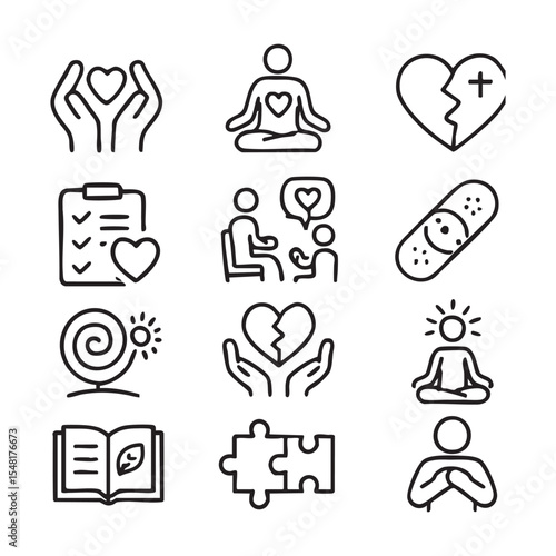 Hand Drawn Mental Health Icons Set Healing Meditation and Therapy.