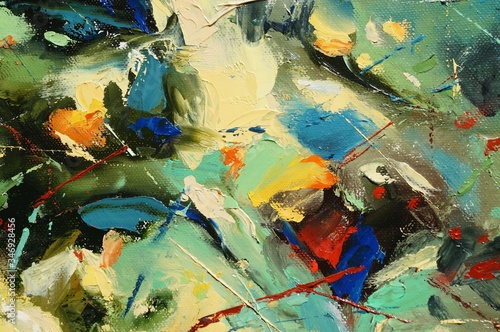 Hand drawn oil painting on canvas. Abstract art background. Color texture. Fragment of artwork. Brushstrokes and spots of paint. Modern, contemporary art. Colorful canvas.