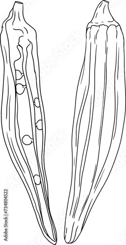 Hand drawn okra plants, Abelmoschus Esculentus. Vector coloring pages of eco healthy food.