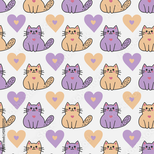 Hand drawn orange and purple cats and flowers. Seamless vector pattern for fabric, background
