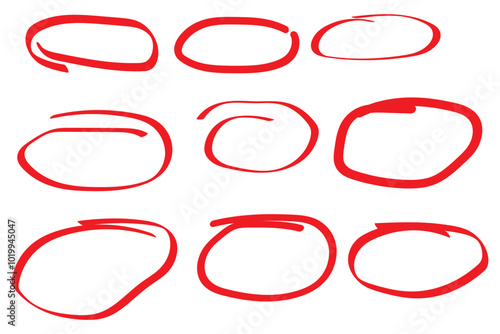 Hand drawn ovals and circles set. Ovals of different widths. Highlight circle frames. Ellipses in doodle style. Set of vector illustration isolated on transparent background.