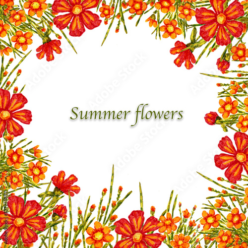 Hand drawn red summer flowers frame, scrapbooking, greeting card, invitation, high quality for print, floral style