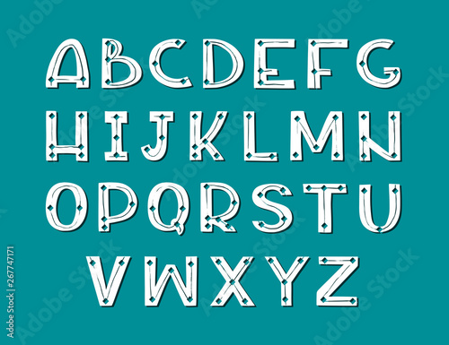 Hand drawn scandinavian art font. White alphabet on dark blue background. Glowing letters for your design, for monograms, initials, logotypes. Vector font set.