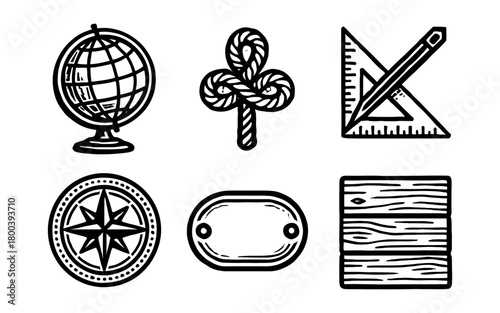 Hand drawn school tools and symbols: globe, ruler, compass, knot, wood, plate
