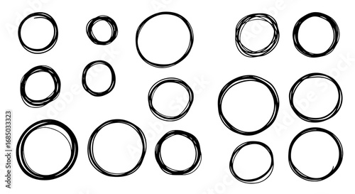 Hand drawn scribble circle set vector graphic design element art outline round shape brush stroke doodle sketch black isolated