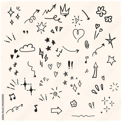 Hand drawn set elements, black on white background. Arrow, heart, love, star, leaf, sun, light, flower, daisy, crown, king, queen,Swishes, swoops, emphasis ,swirl, heart, for concept design.