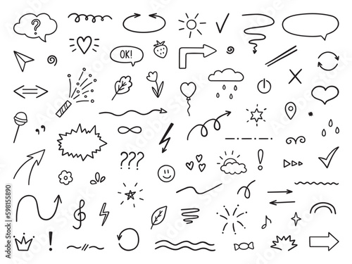 Hand drawn set of abstract doodle elements. Decorative illustrations in sketch style. Arrows, heart, stars, flowers, hearts, signs and symbols. Vector illustration isolated on white background
