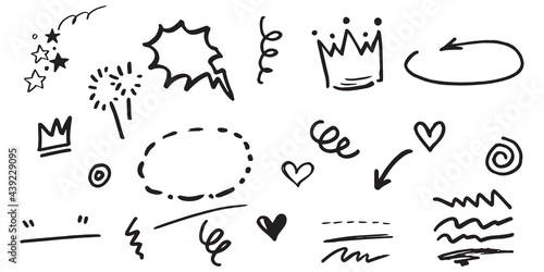 hand drawn set of curly swishes, swashes, swoops. Abstract arrows, Arrow, heart, love, star, leaf, sun, light, crown, king, queen, on doodle style for concept design. vector illustration.
