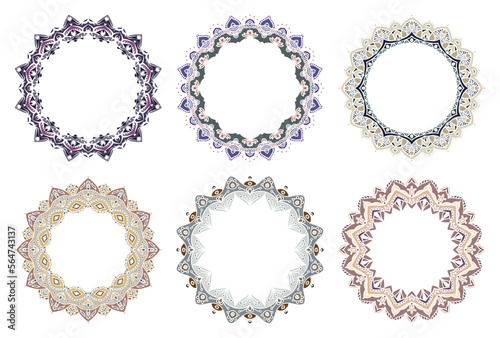 Hand drawn set of decorative round frames for design with floral ornaments. Circle mandala frame. Templates for printing postcards, invitations, books, textiles, yoga, invitation, graphic design