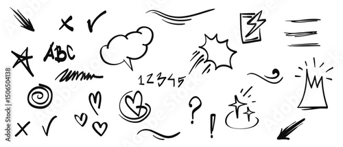 Hand drawn set of doodle design elements. Crown, arrow, curly swishes, bubble speech, star, hearts. used for infographic concept design