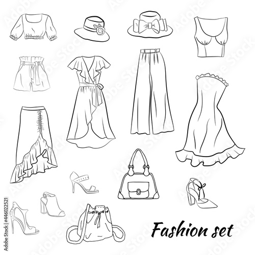 Hand drawn set of fashion women's clothing and accessories. Set of fashion doodles of hats, bags and shoes. Set of hand drawn online fashion shopping. Fashion sketches. Casual style.