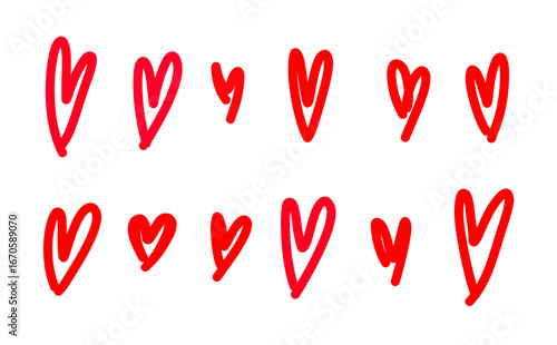 Hand drawn set of hearts in red color. Stylized hearts of different shapes isolated on transparent background. Doodle heart illustration clip art for Valentine's Day. For web, design, cards, stickers