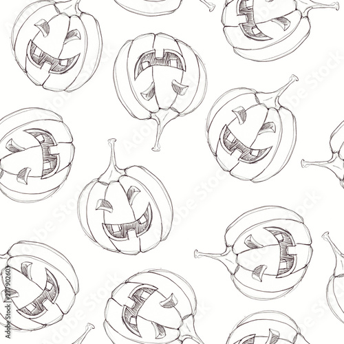 Hand drawn sketch seamless pattern background with illustration Halloween pumpkin