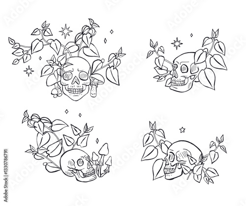 Hand drawn sketchy human skulls surrounded by nettle leaves and muchrooms set isolated on white background. Doodle skeleton head tattoo design