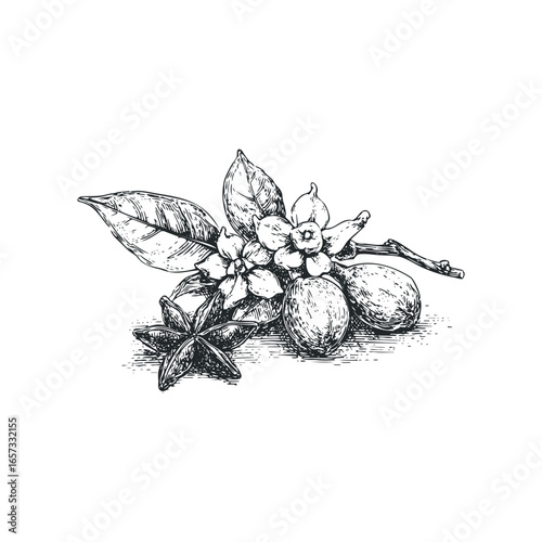 Hand Drawn Star Anise and Coffee Branch with Berries and Flowers