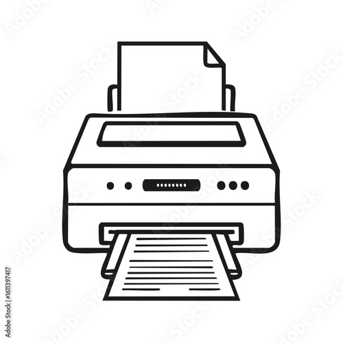 Hand drawn style black and white icon illustration of a home or office printer producing pages