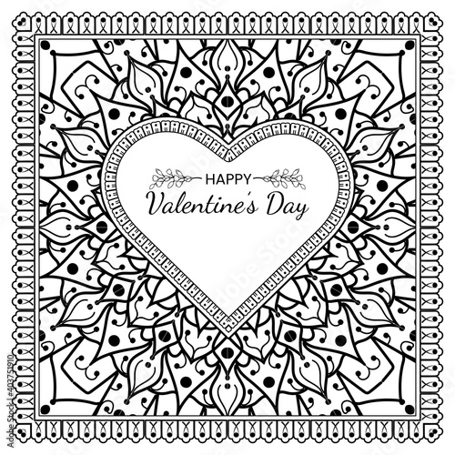 Hand drawn valentines day greeting card or banner with mehndi flower. decoration in ethnic oriental, doodle ornament. outline hand draw illustration.