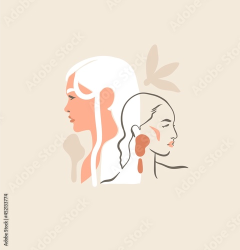 Hand drawn vector abstract stock flat graphic contemporary aesthetic fashion illustration with bohemian,beautiful modern female portrait in simple trendy minimal style isolated on pastel background.