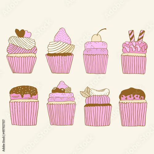 Hand drawn vector illustration of sweet pink cupcake collection in doodle art style