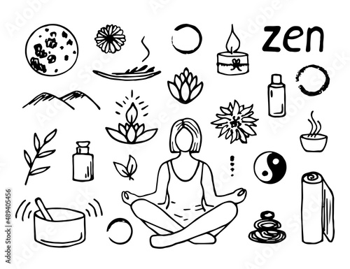 Hand drawn vector set of elements in doodle style. Young woman in lotus position, meditation and relaxation. Harmony of soul and body, unity with nature. Sketch in ink.