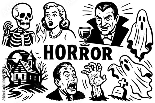 Hand drawn vintage horror illustrations with spooky characters and classic monsters, Transparent Background