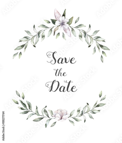 Hand drawn watercolor illustration - Floral wreath. Spring branches with anemone flowers. Perfect for wedding invitations, greeting cards, certificates, prints and more