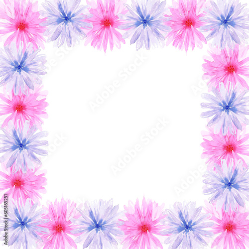 Hand drawn watercolor pink and blue daisy flower frame. Isolated on white background. Scrapbook, post card, banner, lable.
