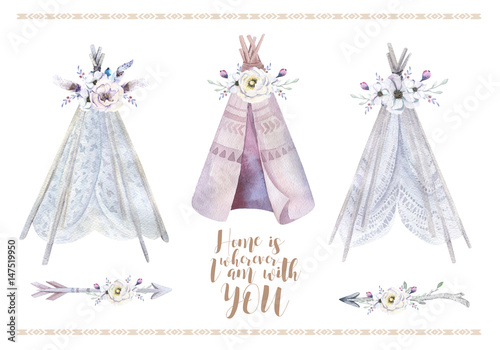 Hand drawn watercolor tribal teepee, isolated white campsite ten
