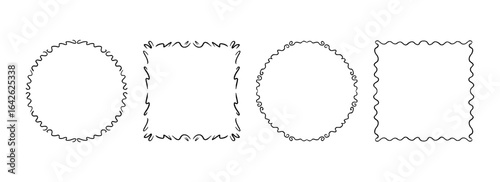 Hand drawn wavy frame set. Black square and circle ribbon border collection. Vector doodled lace cadre frames. Curved squiggly border pack for invitation, wedding, birthday party, greeting card design