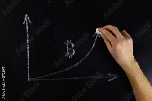 hand draws a bitcoin chart with chalk on a blackboard